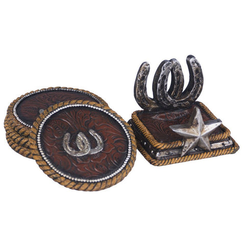These western styled coasters feature a horseshoe and lariat design with tooled leather look center. Set includes four coasters with matching stand. Made of resin.