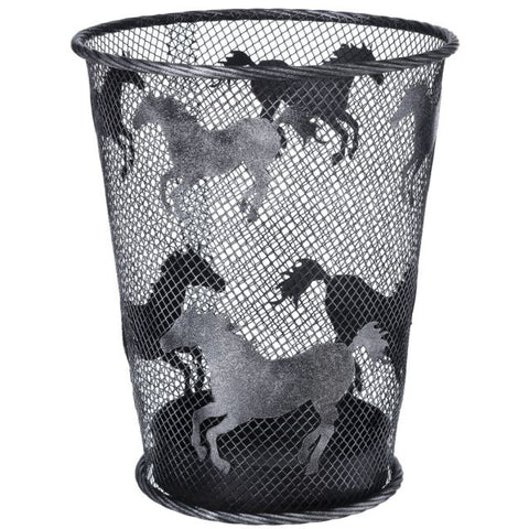 This stylish trash can is perfect for any horse lovers décor. Its compact size makes it functional for the bathroom, office, or horse trailer! Wire mesh design with an antique brushed metal finish and galloping horse silhouettes.