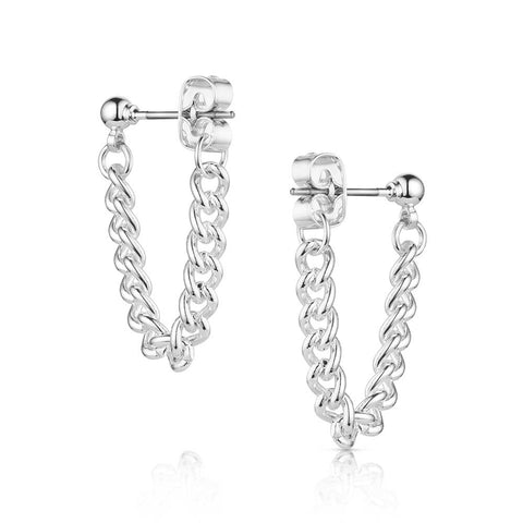 Inspired by the gear of the west, these elegant dangle earrings feature a refined Cuban link chain design that adds a touch of movement and sophistication to any look. The high shine silver toned finish catch light adding a touch of sparkle to any outfit. The Bridle Chain Earrings have unique butterfly backs making these a unique design reminiscent of hoop style earrings with a twist.