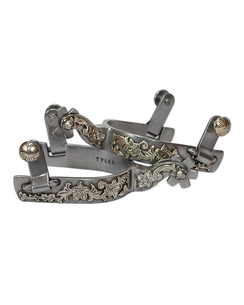 -Constructed with brushed sweet iron-German silver engraved floral/leaf trim-Features flat ended 6 point rowels