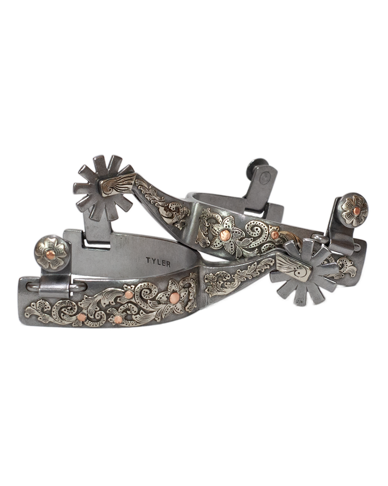 -Constructed with a chrome stainless steel frame-Floral trim made of German Silver and copper dots-Designed with an angled shank and flat ended rowels
