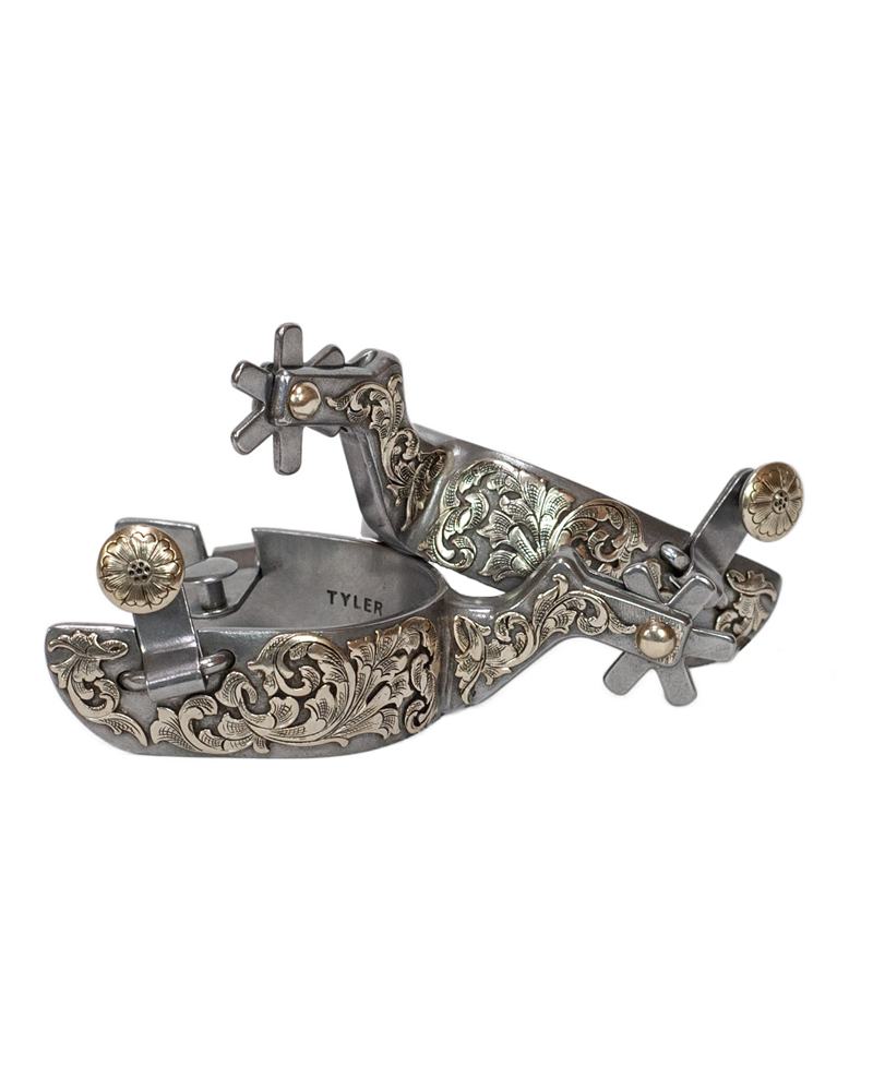 -Constructed with a sweet iron frame-Scroll trim made of engraved German Silver-Designed with an angled shank and flat ended rowels