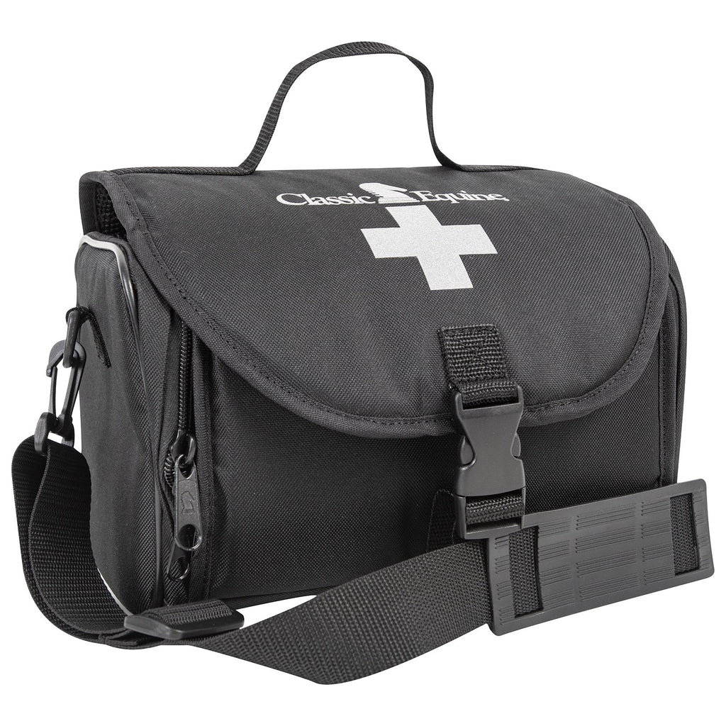 Rigid, fully insulated bag unfolds to hang on the fence with a place for everything you need to take care of your horse on the road or at home. Elastic loops hold medicine bottles securely, keeping them protected from breakage. Place for ice pack keeps meds at the right temperature. Handy zippered pockets hold syringes, needles and other necessities for easy access.